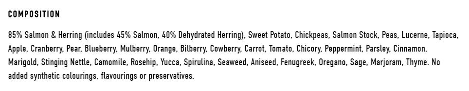 - 주원료: 신선한 연어와 건조청어(85%), 고구마, 병아리콩, 연어육수