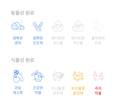 - 주요 특징: 생육, 육류중심, 고육류, 그레인프리, Non-GMO, 인공첨가제프리, 박류 프리, 수비드